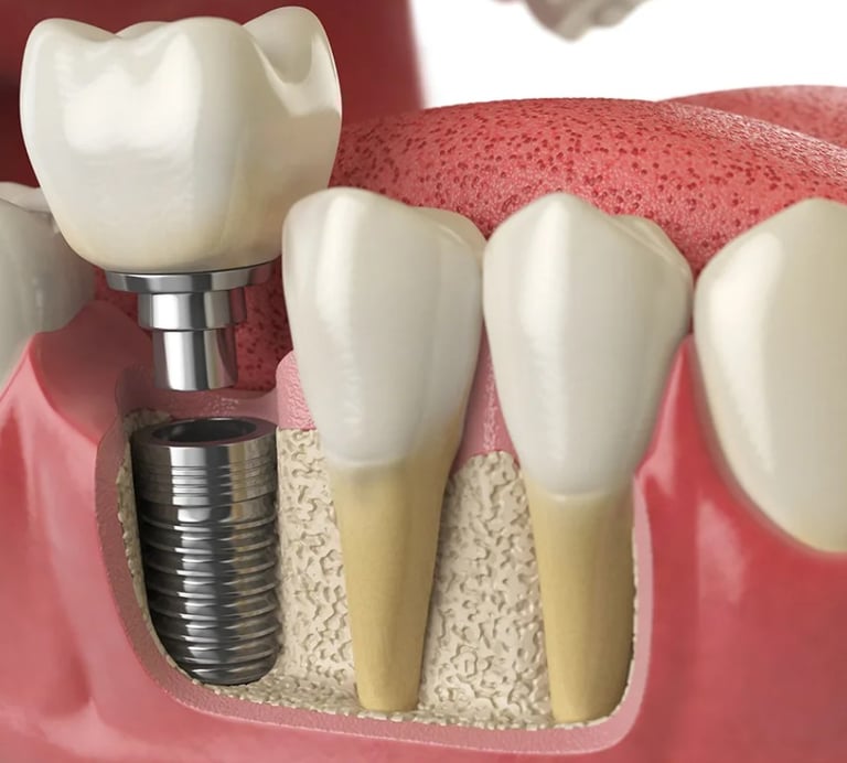 Permanent artificial tooth roots placed in jawbone to support natural-looking replacement teeth and restore chewing.